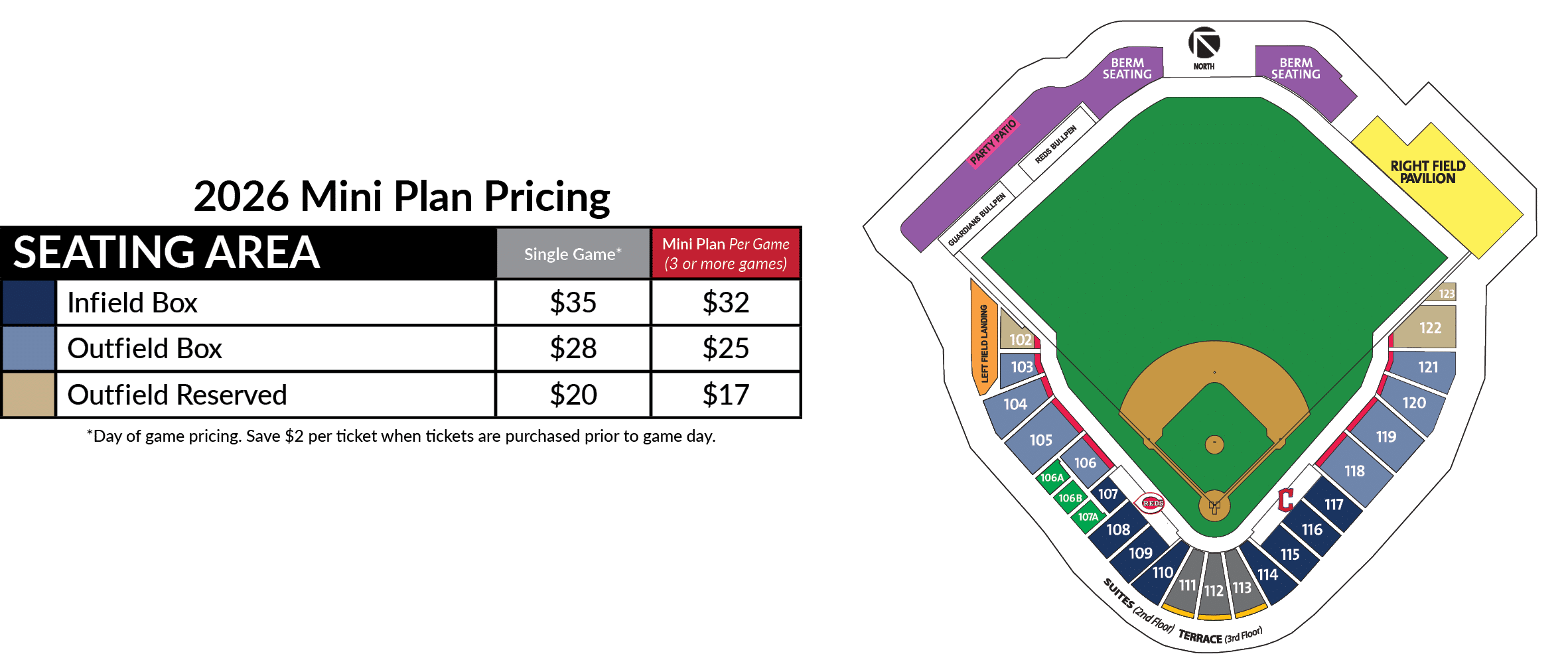 Planning on catching a few games? If you’re purchasing tickets for three or more games, pick up a mini plan. You’ll save money when you purchase them in a single transaction. Mini Plans are available in Infield Box, Outfield Box and Outfield Reserved seating.