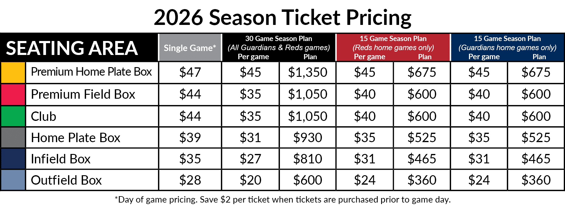 Goodyear Ballpark offers three different spring training season ticket plans for those who’d like to keep their same seats for every game – choose from all Cleveland or Cincinnati home games in Goodyear, or a full season plan, which includes tickets to all home games for both teams!